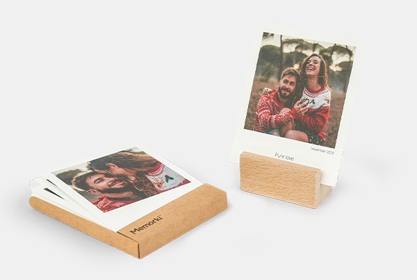 To zdjęcia w stylu retro, które mają ten unikalny klimat i miejsce na krótki podpis. Wydrukuj zestaw waszych ulubionych kadrów i… poukrywaj je w całym domu. Jeden w kieszonce płaszcza, drugi przyklejony do lustra w łazience, trzeci w puszce z kawą, czwarty w zakładce jej ulubionej książki. Niech szuka! To prezent, który trwa dłużej niż moment wręczenia. Oczywiście znalezioną fotkę można postawić na drewnianej podstawce, którą domówisz w zestawie do memorek.